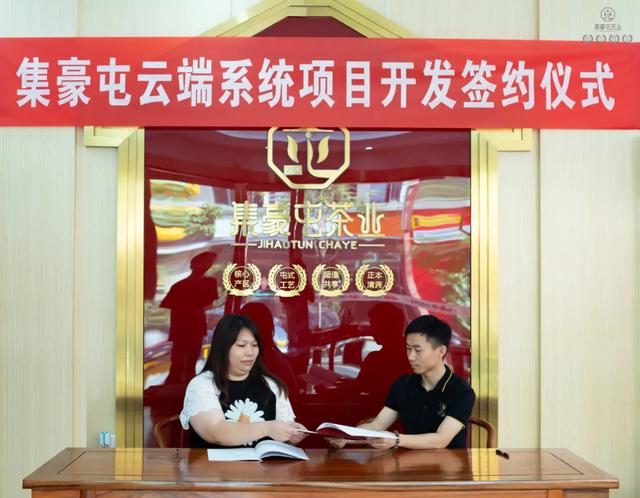 集豪屯茶業薛總與找茶網絡林總代表雙方企業簽約,通過發揮找茶網絡在互聯網、人工智能、云計算等方面的核心技術優勢,圍繞集豪屯共享系統和新零售系統的開發開展戰略合作。